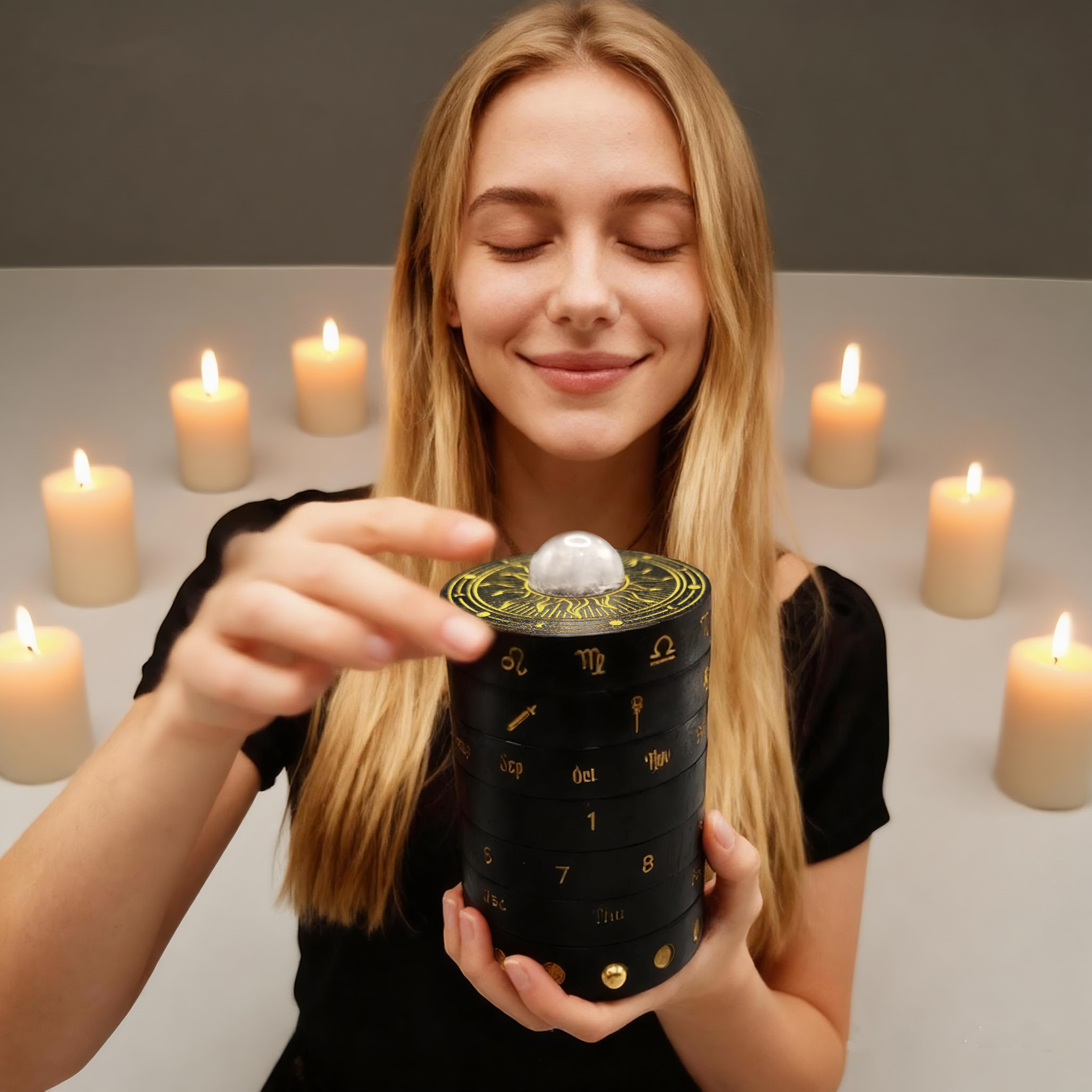 The Tarot Fortune Calendar merges mystery and time into one. Seven finely carved black oak rings map the twelve zodiac signs, elements, lunar phases, and the cycle of the seasons. With each gentle spin, the soft click of the ratchet becomes a meditative whisper, inviting you into a personal ritual of divination. More than just a tool for marking time, it is a work of art and a daily companion for reflection, balance, and mindfulness.