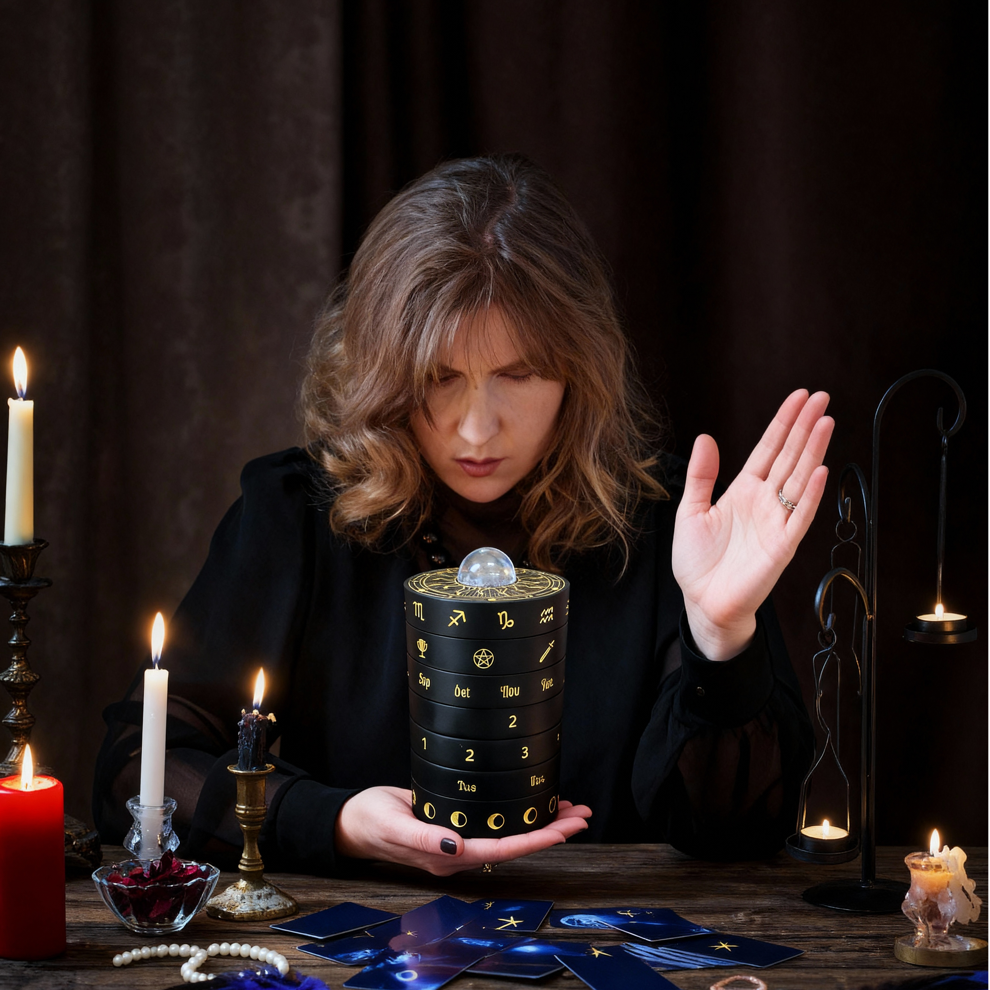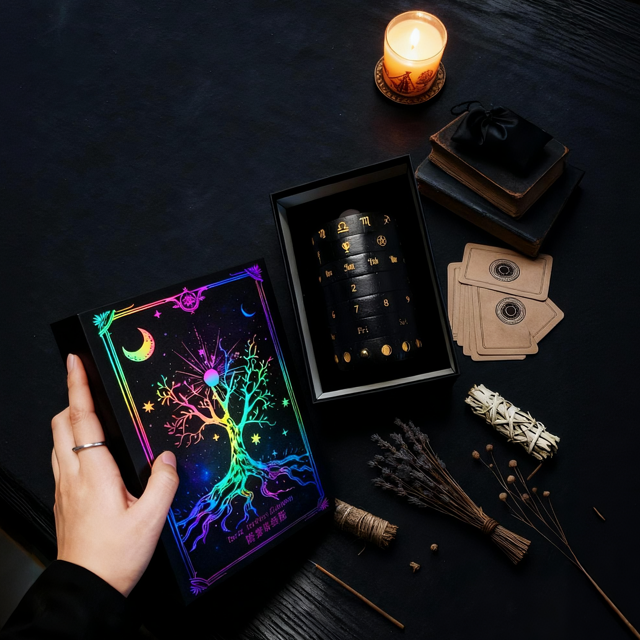 The "Tarot Fortune Calendar" is an innovative product that integrates Tarot philosophy with daily life. Through a system of 7 rotatable discs, it creates a complete interactive framework linking "Time – Space – Energy – Action". Each layer of symbols carries unique energetic guidance, supporting users in self-awareness, decision-making assistance, and adjusting their life rhythm.